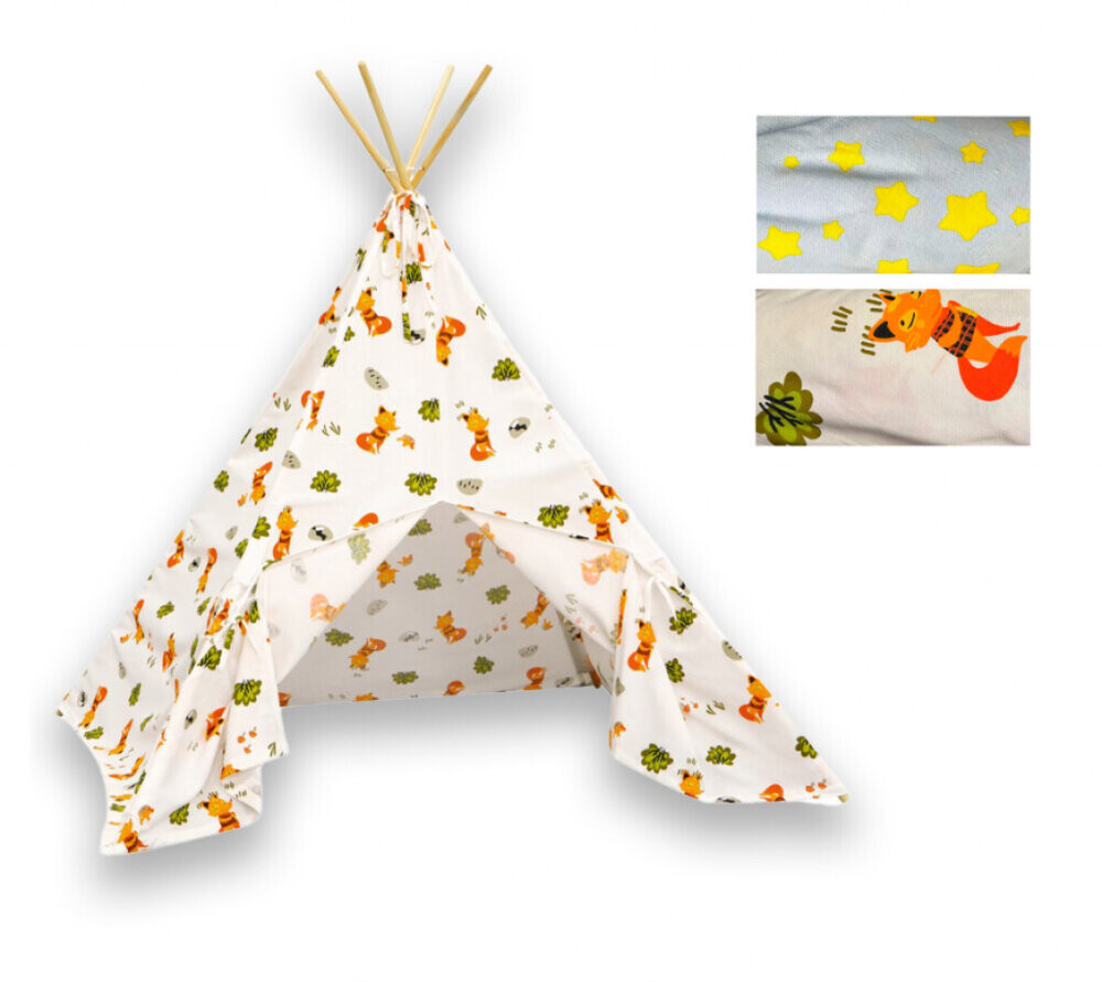 Детска типи палатка от плат за игра, почивка или четене. Размери: 125 х 125 х 140 см; Материал: 75% памук – дишаща материя, която не запарва; Конструкция: Крака от FSC сертифицирана борова дървесина – екологично чист и устойчив материал; Цвят: Бял, син.