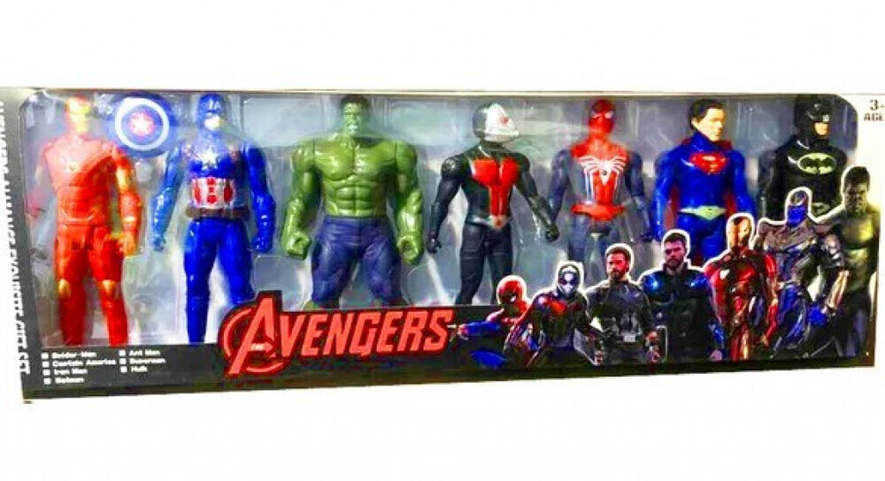 Не един а цели супер героя в един комплект, от известната серия играчки „Отмъстителите“, които със сигурност ще предизвикат интереса на вашето дете и ще задържат вниманието му за дълго време! Комплектът включва фигурките на капитан Америка, Железния човек, Хълк, Супермен, Ястребово око, Спайдърмен и Батман, които са изработени по точен образ и подобие на оригиналните герои на Марвел. Фигурките имат подвижни елементи и могат да си мърдат ръцете, краката, главата, да заемат различни бойни позиции. Светът винаги е в опасност, но супер героите са неуморни в битката със злото. Всеки от супер героите има специални способности, които ще развият въображението на вашето дете в играта. Капитан Америка, разполага със свръх оръжия и технологии, железният човек има супер костюм, с който може да лети и става неуязвим, Хълк се трансформира, Ястребово око има супер възможности и вижда в бъдещето, Спайдърмен има способности да се движи във въздуха като използва паяжина, Батман се движи във въздуха със специални технологии, използва и батмобила като самолет. Всяко дете би се радвало да притежава, този комплект от супер герои, които да бъдат винаги до него в игрите. Ако искате да доставите радост и щастие на своето дете, в игрите, то този комплект от любими супер герои със сигурност ще ви помогне.