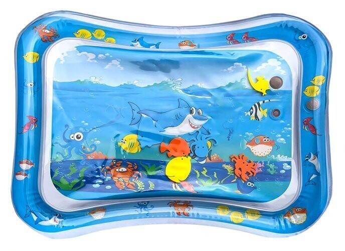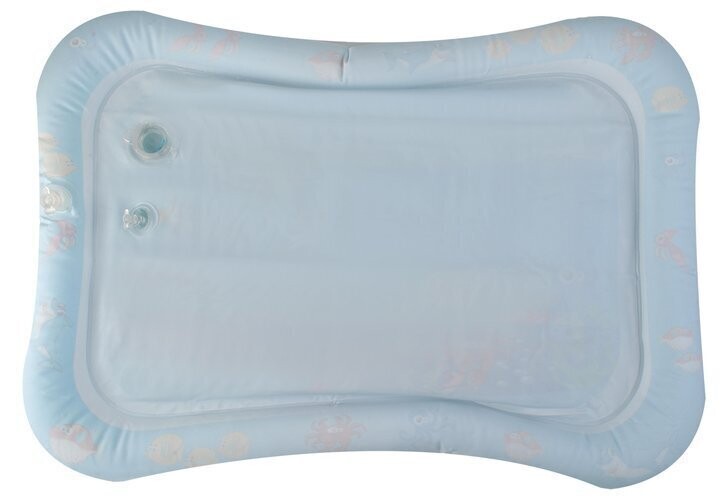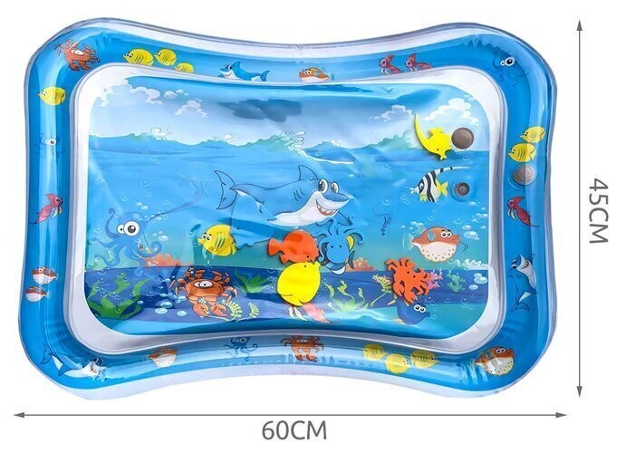Надуваемо водно килимче за бебета (60 x 45 см), подходящо за възраст 3 месеца+. Стимулира двигателните и зрителни умения с плуващи животни. Лесно за надуване/пълнене с вода и почистване. Идеален подарък за развитие на бебето.
