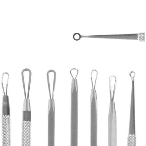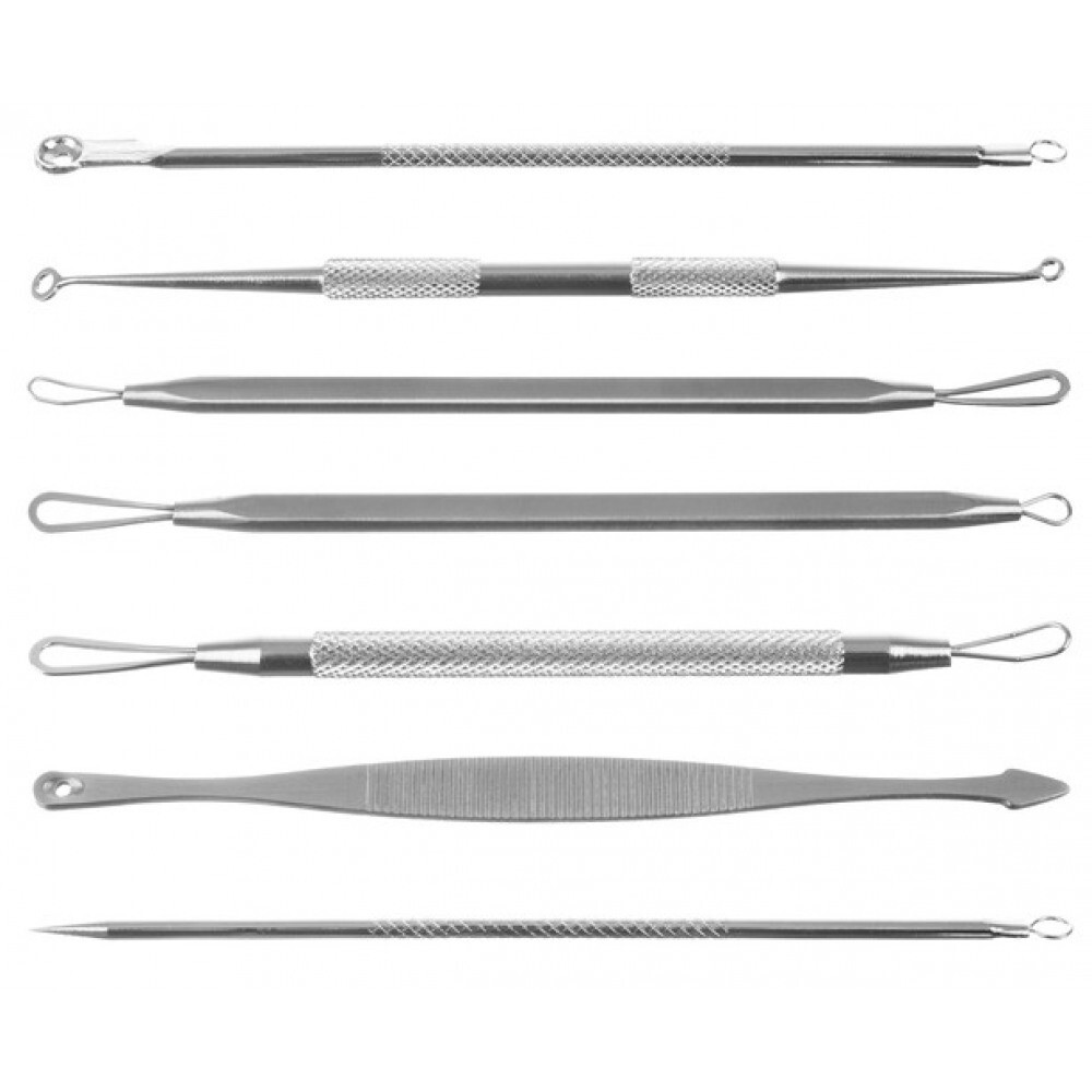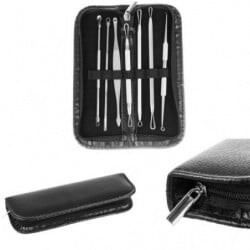Комплект за премахване на черни точки. Комплект от 7 двустранни лъжички за безопасно премахване на черни точки и пъпки. Професионалните лъжици с примки са предназначени за махане на черни точки и други замърсявания по лицето. Перфектен за премахване на пъпки, дори и на труднодостъпни места. За разлика от „ръчното изстискване“, примките не нараняват кожата и не разпространяват бактерии, водещи до допълнителни кожни инфекции. Инструментите помагат за премахване на пъпки, черни точки и черни точки по наистина хигиеничен начин. Изработени от хигиенична неръждаема стомана, която лесно се дезинфекцира и стерилизира. Достатъчно е да ги потопите в спирт или да ги поръсите със спирт. В комплекта има елегантен, черен калъф с цип. Благодарение на него винаги ще имате всички инструменти на едно място, а съхранението няма да е проблем. Калъфът може да се побере дори в малка чанта и дори в джоб.