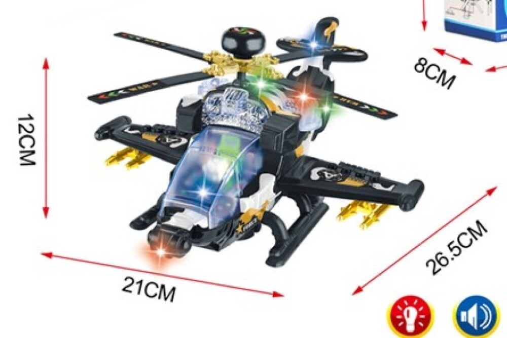 Детски боен хеликоптер играчка със звук, светлини и движение. Реалистичен дизайн и издръжлива изработка. Размери 21х26.5х12 см. Идеален подарък за деца!