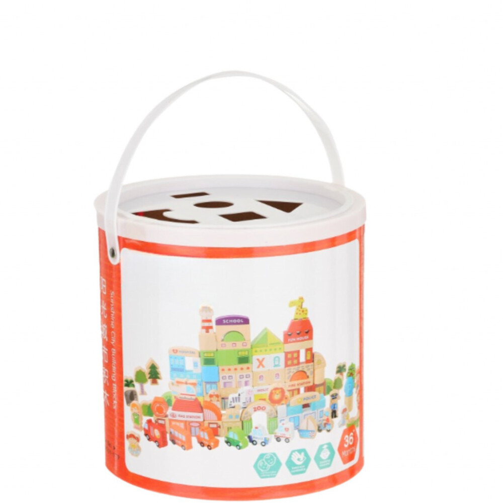 Този 120-частичен комплект дървени блокчета е идеален за комбиниране на строителни игри и ранно обучение. Блокчетата са отпечатани с букви и цифри, подпомагайки развитието на фини двигателни умения и креативността. Изработени от висококачествено и безопасно дърво, те пристигат в практична кофа за лесно съхранение.
