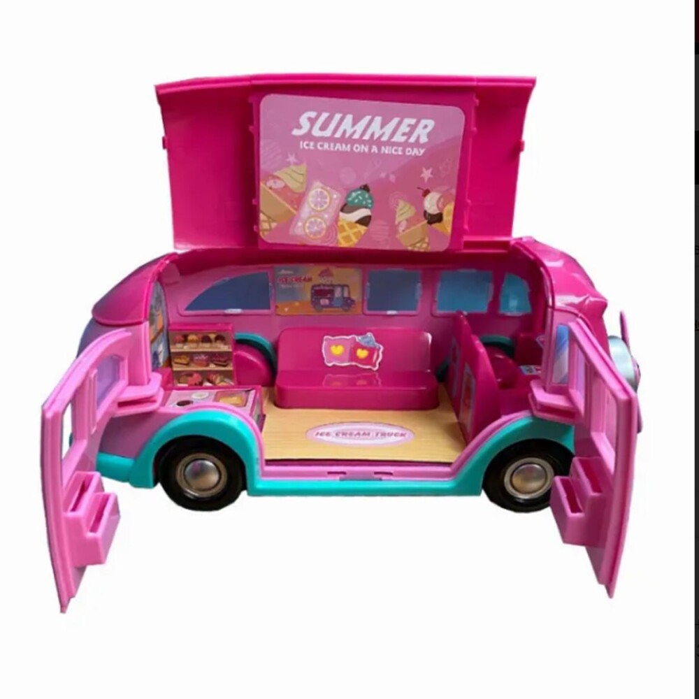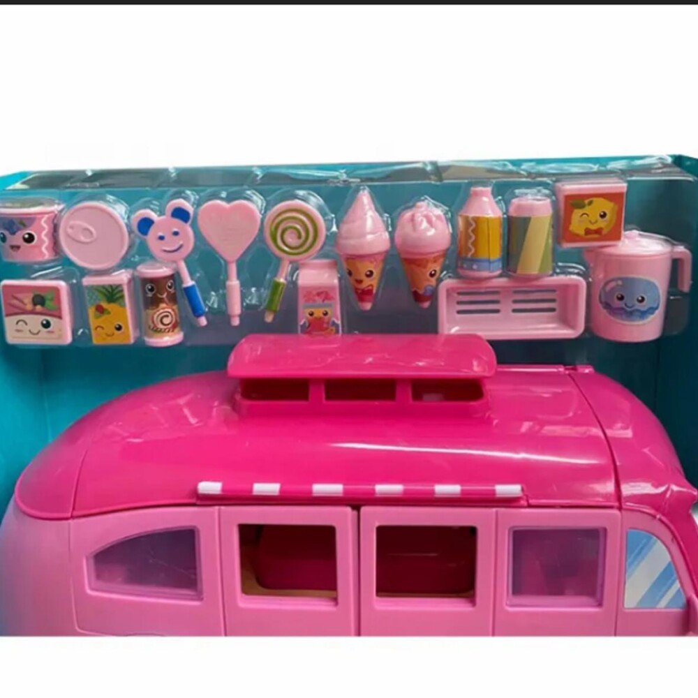 Цветен Камион: Голям, детайлен камион в приказно розово и тюркоазено с щастлив дизайн и стикери "Sweet Treats". Камионът има отварящ се покрив, който позволява лесен достъп до интериора за обслужване на клиенти.