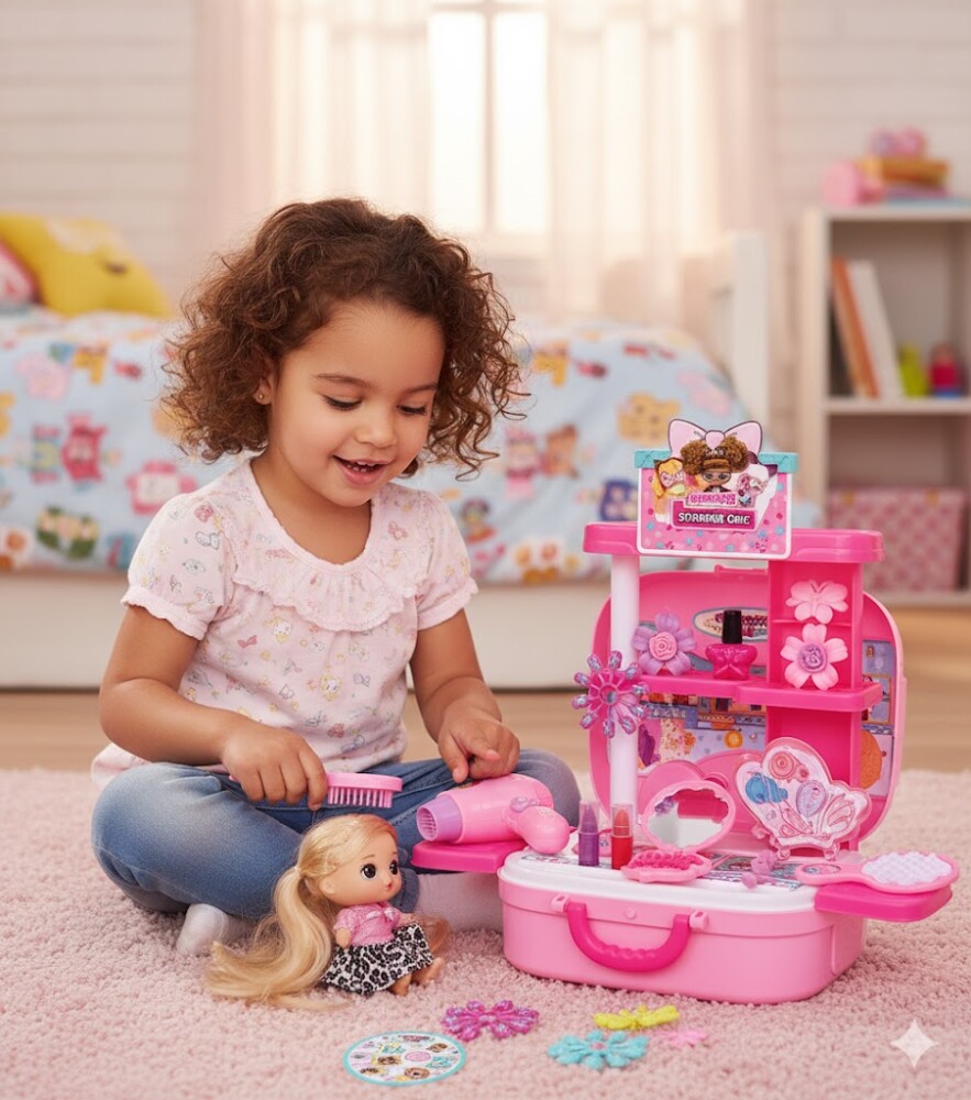 Розово куфарче на колелца, което само с няколко движения ще се трансформира в кокетна тоалетка с всички необходими аксесоари за разкрасяване: огледало, четка за коса, сешоар, сенки в палитра-пеперуда, 2 ластичета с цвете, и какво ли още не! Ще намерите и лепящи стикери, с които вашата тоалетка ще стане още по-красива! · Размери на куфарчето в см: 23,5 х 10,5 х 20,5 · Материал: нетоксични съставки, пластмаса · Подходящо за деца над 3 год. · Произведено в Кита