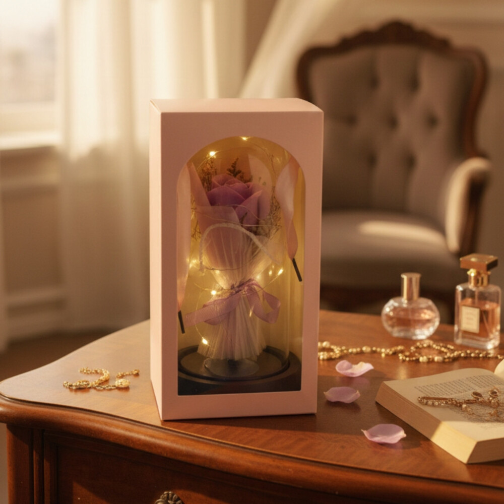 Без ангажименти: Забравете за вазите, смяната на вода или подрязването. Розата е защитена от прах и външни влияния под своя стъклен купол и не изисква никаква поддръжка.
