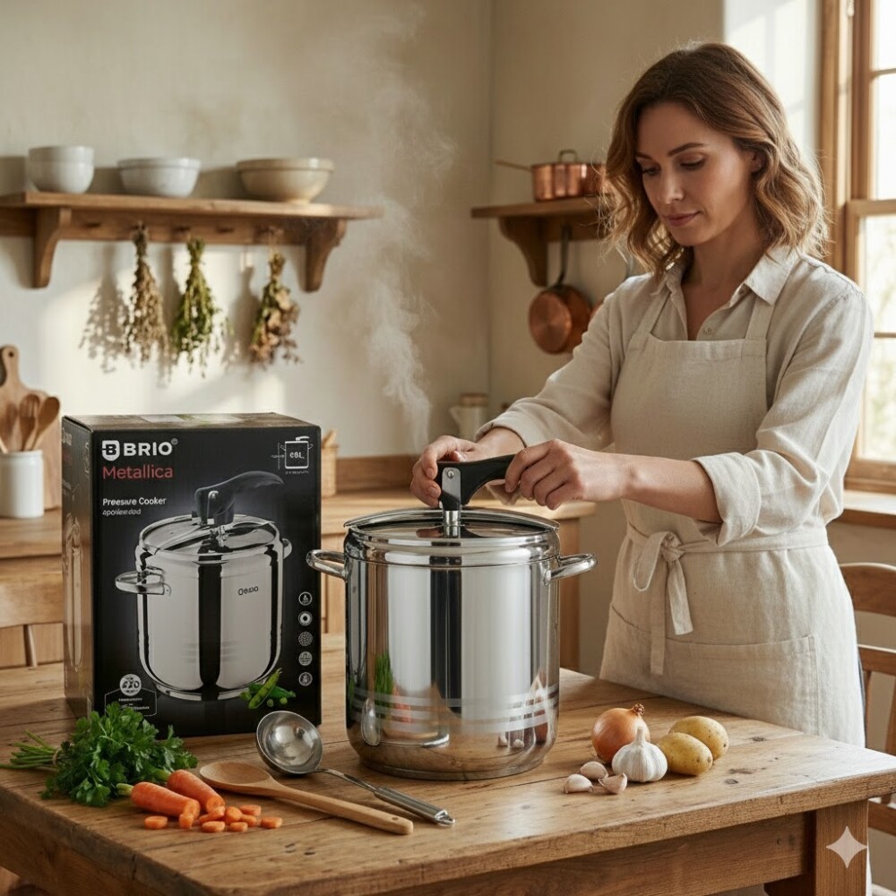 Тенджерата под налягане BRIO 9л е вашият съюзник за бързо и енергоспестяващо готвене. Изработена от неръждаема стомана с индукционно дъно, тя предлага 3 нива на защита и капацитет, идеален за големи домакинства. Гответе здравословно, спестявайте време и се доверете на сертифицираната безопасност от BRIO.