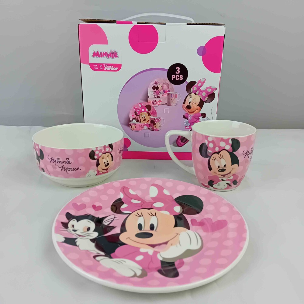 Порцеланов комплект за хранене Disney Minnie – 3 части Направете всяко хранене вълшебно с този очарователен сет от любимата поредица на Дисни. Комплектът включва плитка чиния, практична купа и удобна чаша, създадени специално за малките почитатели на Мини Маус. Изработен от първокласен, устойчив порцелан, сервизът съчетава безопасност и дълготрайност с наситени, жизнерадостни цветове.