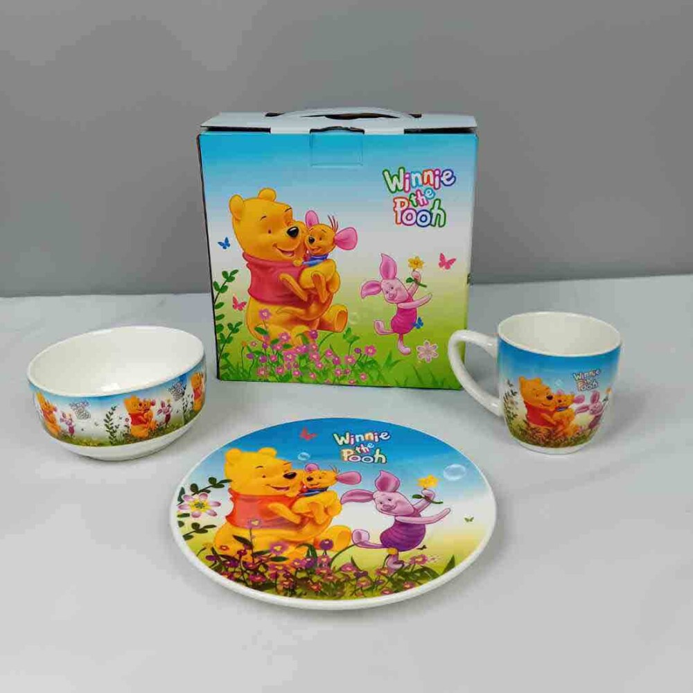 Порцеланов комплект за храненеКолите – 3 части Направете всяко хранене вълшебно с този очарователен сет от любимата поредица на Дисни. Комплектът включва плитка чиния, практична купа и удобна чаша, създадени специално за малките почитатели на Мечо пух . Изработен от първокласен, устойчив порцелан, сервизът съчетава безопасност и дълготрайност с наситени, жизнерадостни цветове.