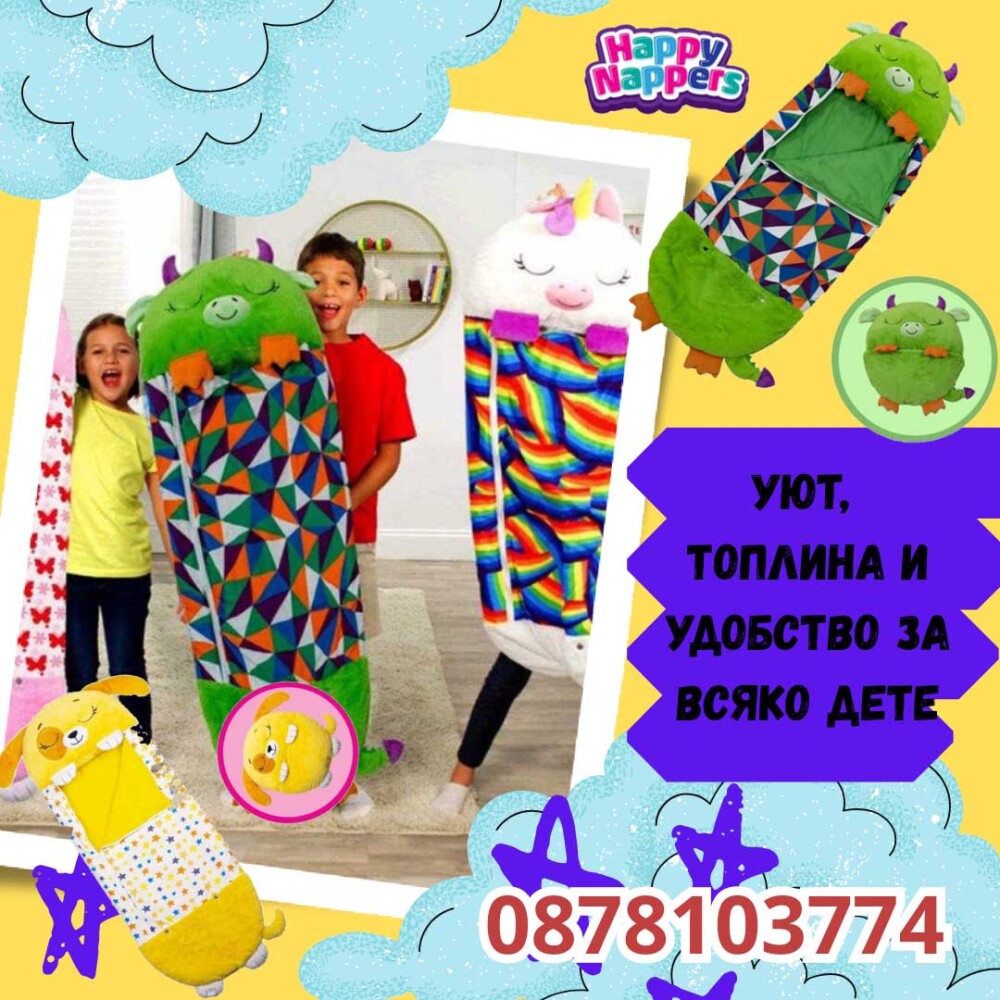 Световноизвестния продукт Happy Nappers е вече у нас! Подарете на детето си двойна доза уют и комфорт с детския спален чувал и възглавница за игра Happy Nappers.
