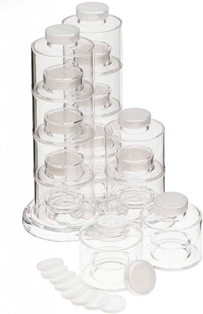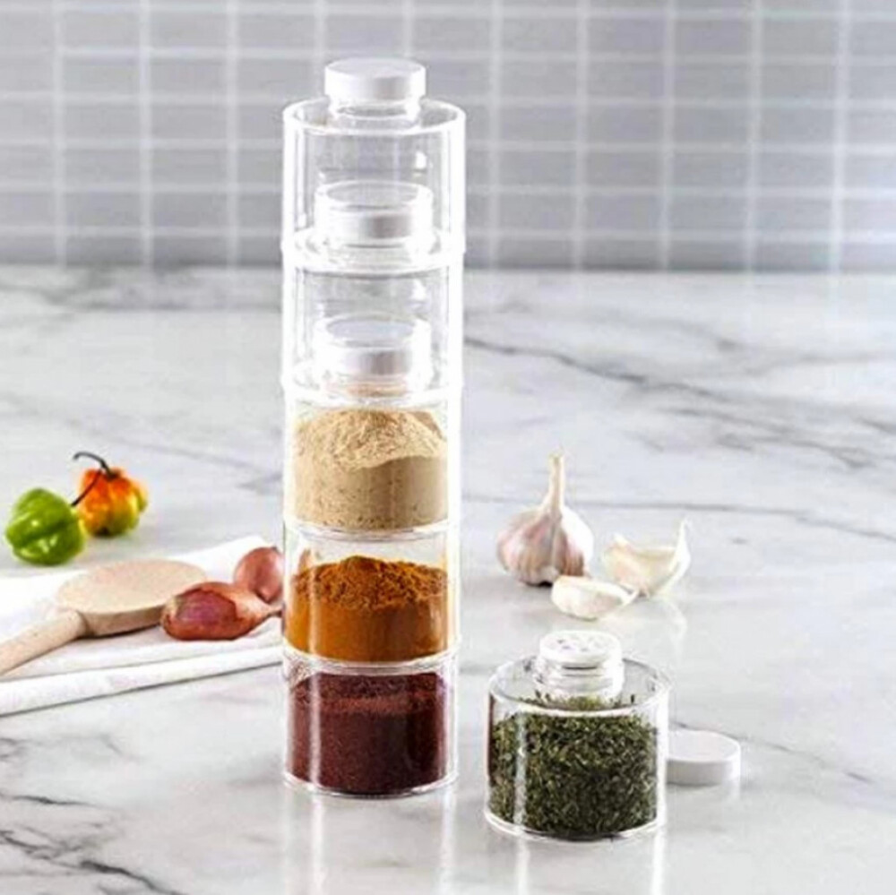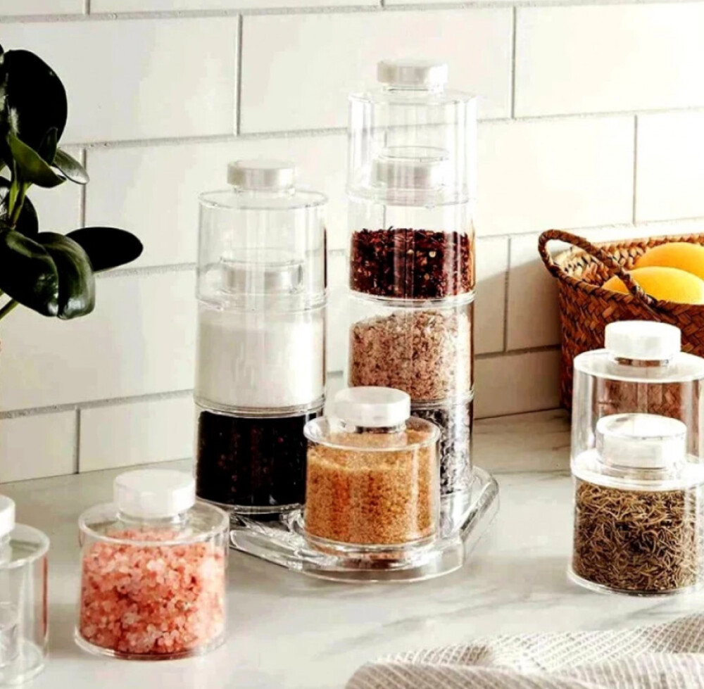 Благодарение на прозрачния акрил, виждате съдържанието веднага, а въртящата се основа осигурява бърз достъп до всяка подправка. С херметическите капачки ароматите и свежестта се запазват по-дълго.
