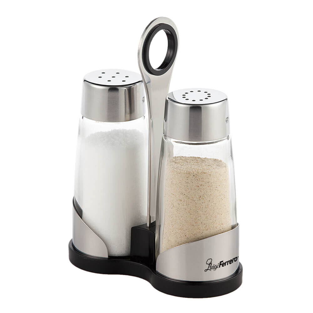Стилен и практичен комплект солници от Luigi Ferrero Vienna. Две солници по 60 ml и удобна метална стойка за лесно пренасяне и сервиране. Идеален за домашна употреба или професионален кетъринг. Изработен от неръждаема стомана, стъкло и пластмаса. Почистване в съдомиялна и 10 години гаранция.