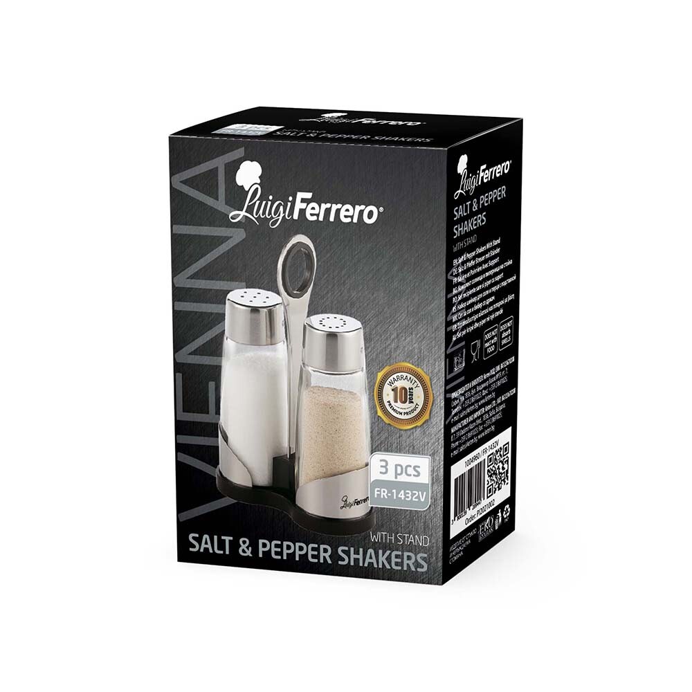 Комплект солници на стойка Luigi Ferrero Vienna, състоящ се от две солници с вместимост 60 ml и удобна метална стойка. Изработен от висококачествена неръждаема стомана 18/8, стъкло и пластмаса, комплектът е подходящ както за домашна употреба, така и за професионален кетъринг. Може да се почиства в съдомиялна машина и се предлага с 10-годишна гаранция.